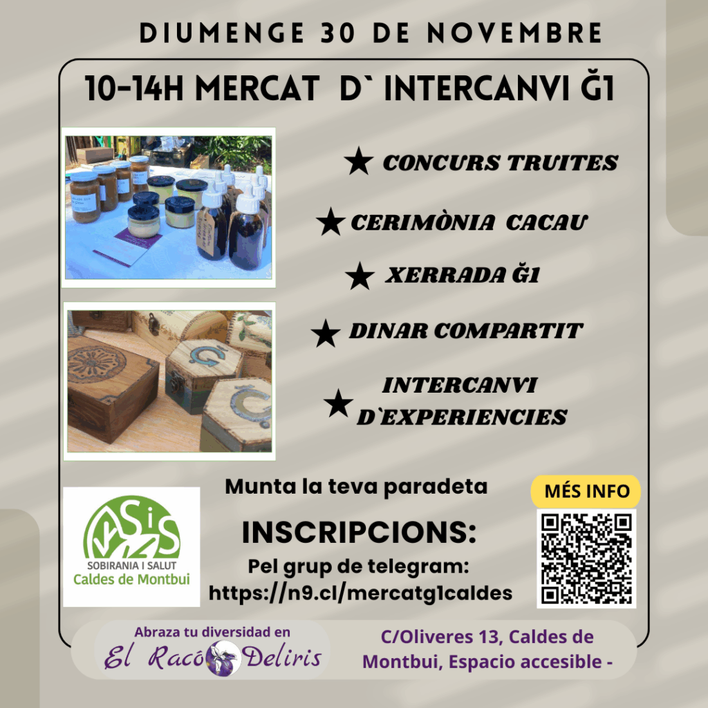Després de l’èxit del setè mercat, seguim amb ganes de donar a conèixer la Ğ1 i retrobar-nos. LLOC: Racó “Deliris” Carrer les Oliveres 13, 08140, Can Masponç, Caldes de Montbui.