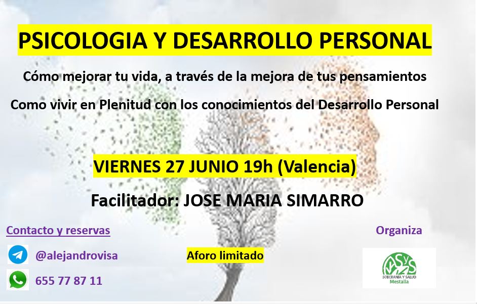 GRUPO SYS MESTALLA – Charla Psicología y Desarrollo Personal – Junio 2025 25 de junio de 2025Acciones grupos, Agenda MensualSoberanía y Salud Contacto y Reservas: Alejandro – @alejandrovisa (Telegram) Tlf. 655778711 (WhatsApp)