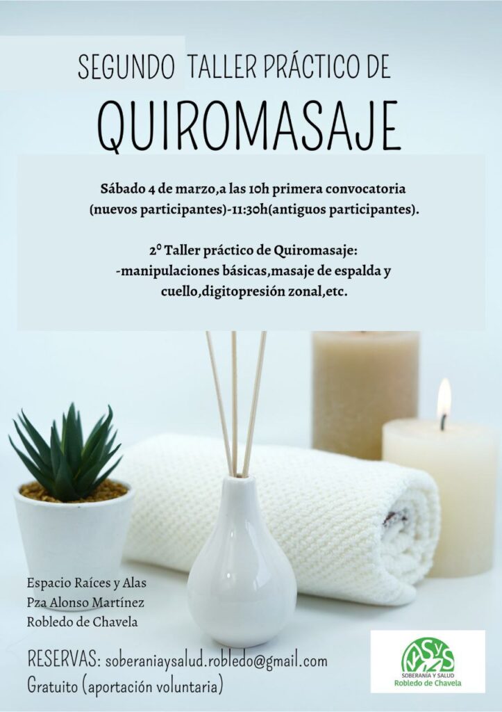 El próximo sábado 4 de marzo realizaremos el 2º taller de Quiromasaje, en Espacio Raíces y Alas (Robledo de Chavela, Madrid). Toda la información la tenéis en el cartel adjunto.